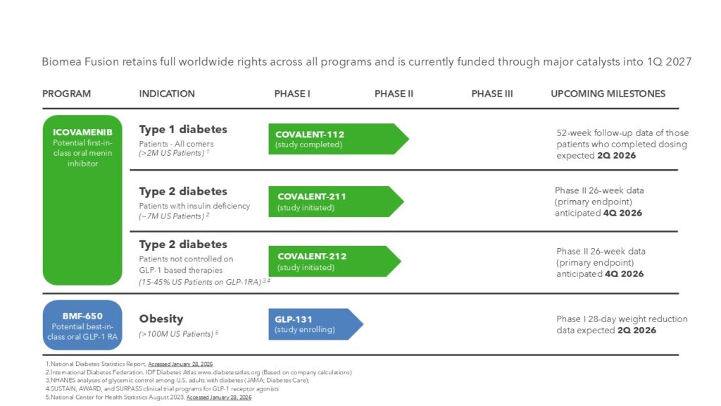 Biomea Fusion is prioritizing the development of BMF-650, an investigational, next-generation, oral small-molecule GLP-1 receptor agonist (GLP-1 RA), which has demonstrated positive, early preclinical activity, including improved glucose-stimulated insulin secretion, reduction in blood glucose concentration, appetite suppression and weight loss in cynomolgus monkeys.